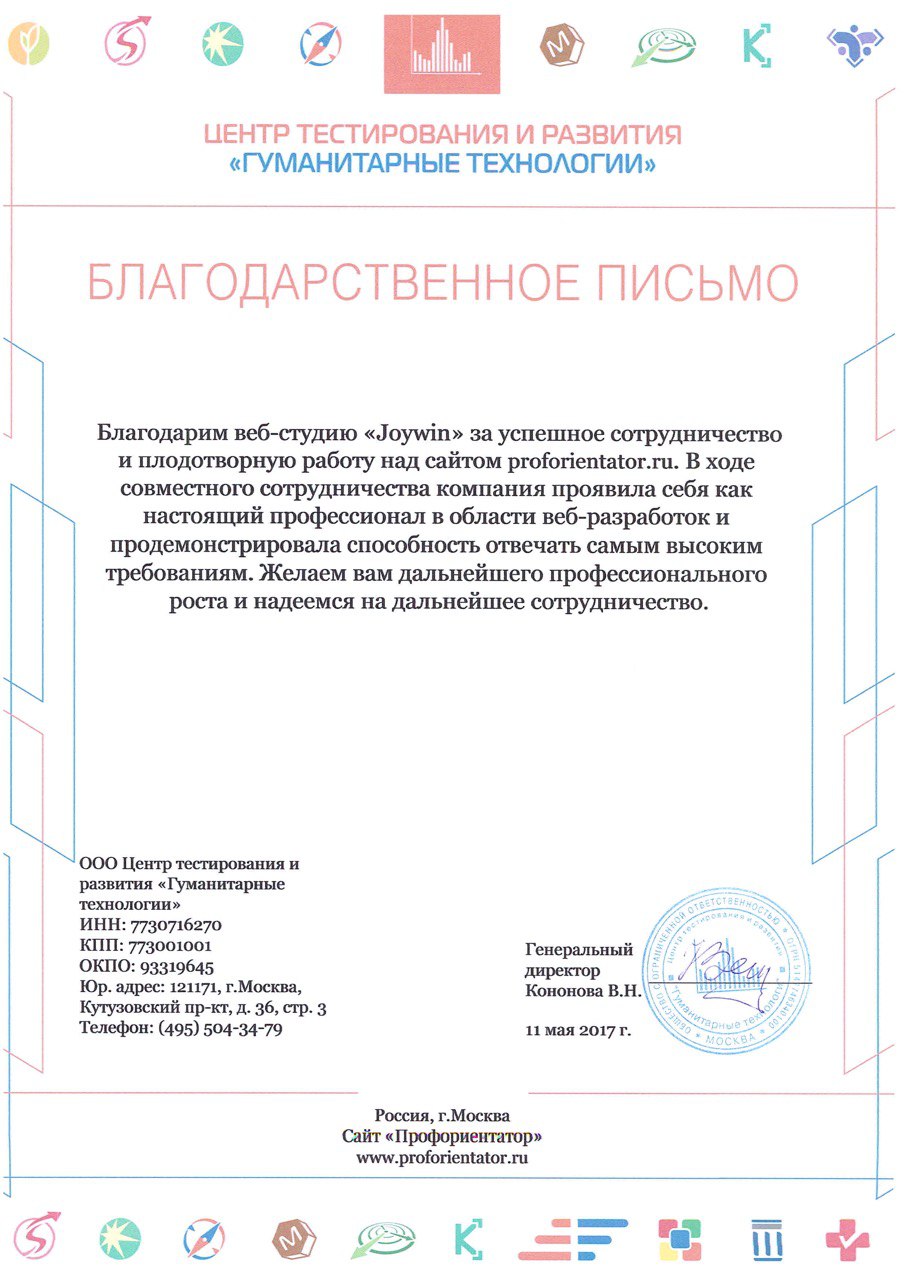 ЦТР «Гуманитарные технологии» выражает искреннюю благодарность веб-студии JoyWin за плодотворное сотрудничество, которое длится уже несколько лет. За это время было создано два масштабных проекта, на регулярной основе проводятся работы по отдельным задачам.